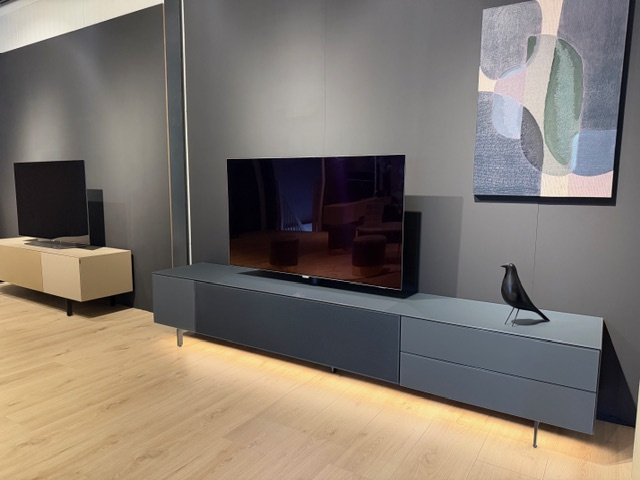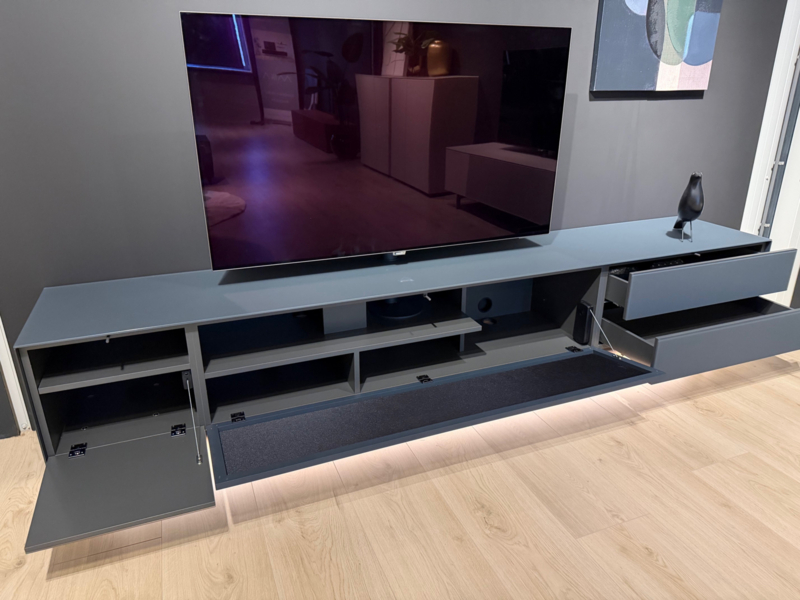 Het betreft een showroom model in nieuwstaat. Het meubel heeft links een gesloten klep van 40 cm, in het midden een media element van 140 cm en rechts een dubbele lade van 80 cm.