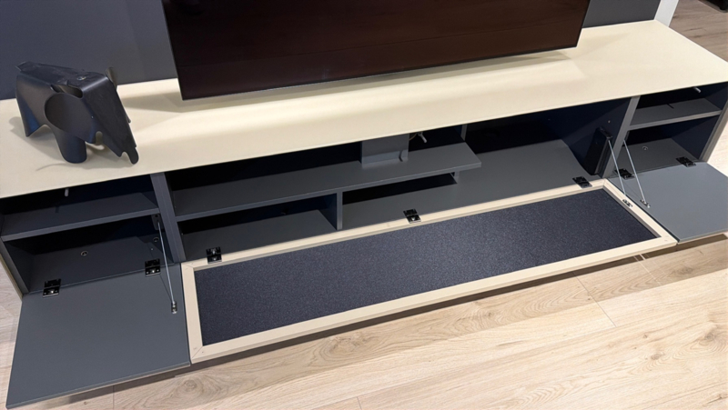 Het betreft een showroom model in nieuwstaat. Het meubel heeft links een gesloten klep van 40 cm, in het midden een media element van 140 cm en rechts een gesloten klep van 40 cm.