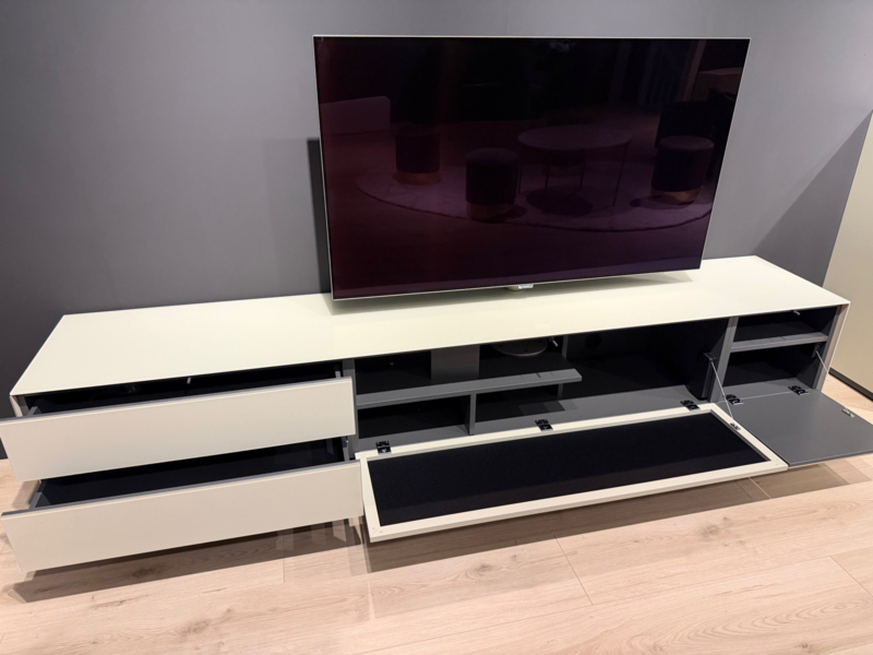 Het betreft een showroom model in nieuwstaat. Het meubel heeft links een dubbele lade van 80 cm, in het midden een media element van 120 cm en rechts een gesloten klep van 40 cm.