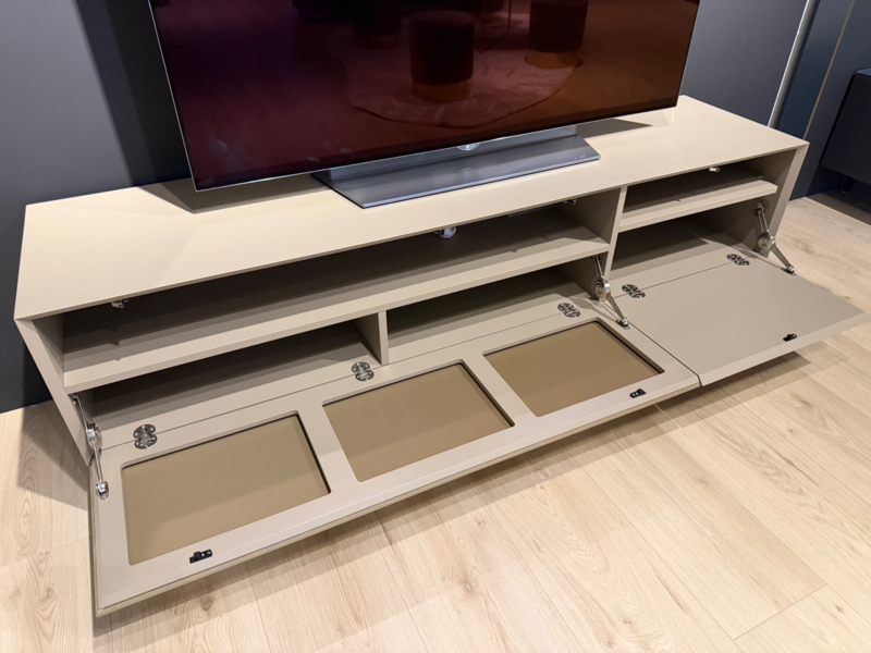 Het betreft een showroom model in nieuwstaat. Het meubel heeft links een media klep en rechts een gesloten klep.