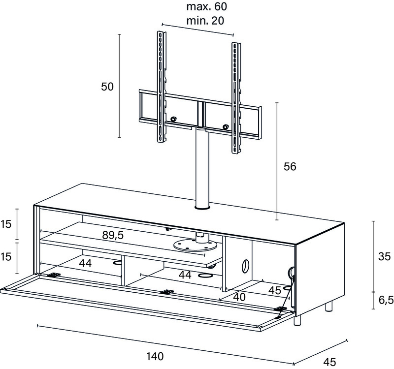 Elk Mika tv meubel kan uitgevoerd worden met een handige zwarte tv beugel waar alle kabels naar de tv in verdwijnen. Jouw tv zweeft strak boven het meubel.